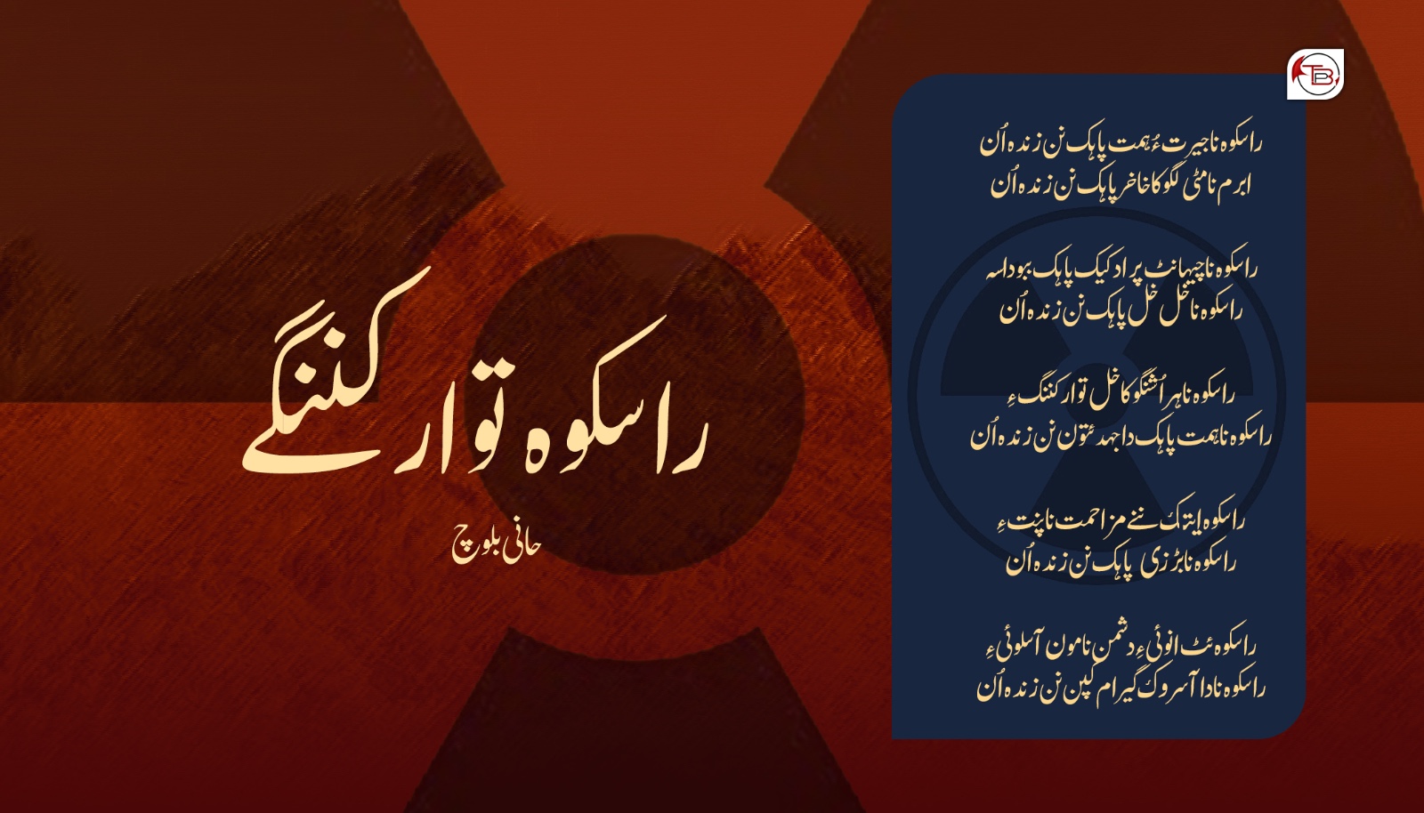 شہید بلال کونا سنگت آک ڈیہہ ئنا فرزند آک ناز شان ئٹی گٹ ئنا زگرنگو دتر تیرہ اوفتا فکر جوزہ سخت پینگُن ءِ۔ اوفتا فکر دژمن نا تنخواہ خور آ فوجی پُلِنگ کپّک دا شہید آتا فکر داسا ننا نُما کوپہ غاٹے دا شہید آتا توفک داسا ننا زمہ واری ءِ شہید آتا فکر و جوزہ و دھرتی نا کنڈ کنڈ آ سر کین دا ننا نُما فرض ءِ دا گُڑا دا فرض ئے ننے ہر حال ئات ادا کروئی ءِ اسلمی فرزند آک ڈیہہ ئنا گواڑخ آتے دتر ئٹ رُدیفینو اسلمی فرزند آک جنگ بارود بمب آتا توار ئٹی بھلن مسُنو فکر جوزہ تو