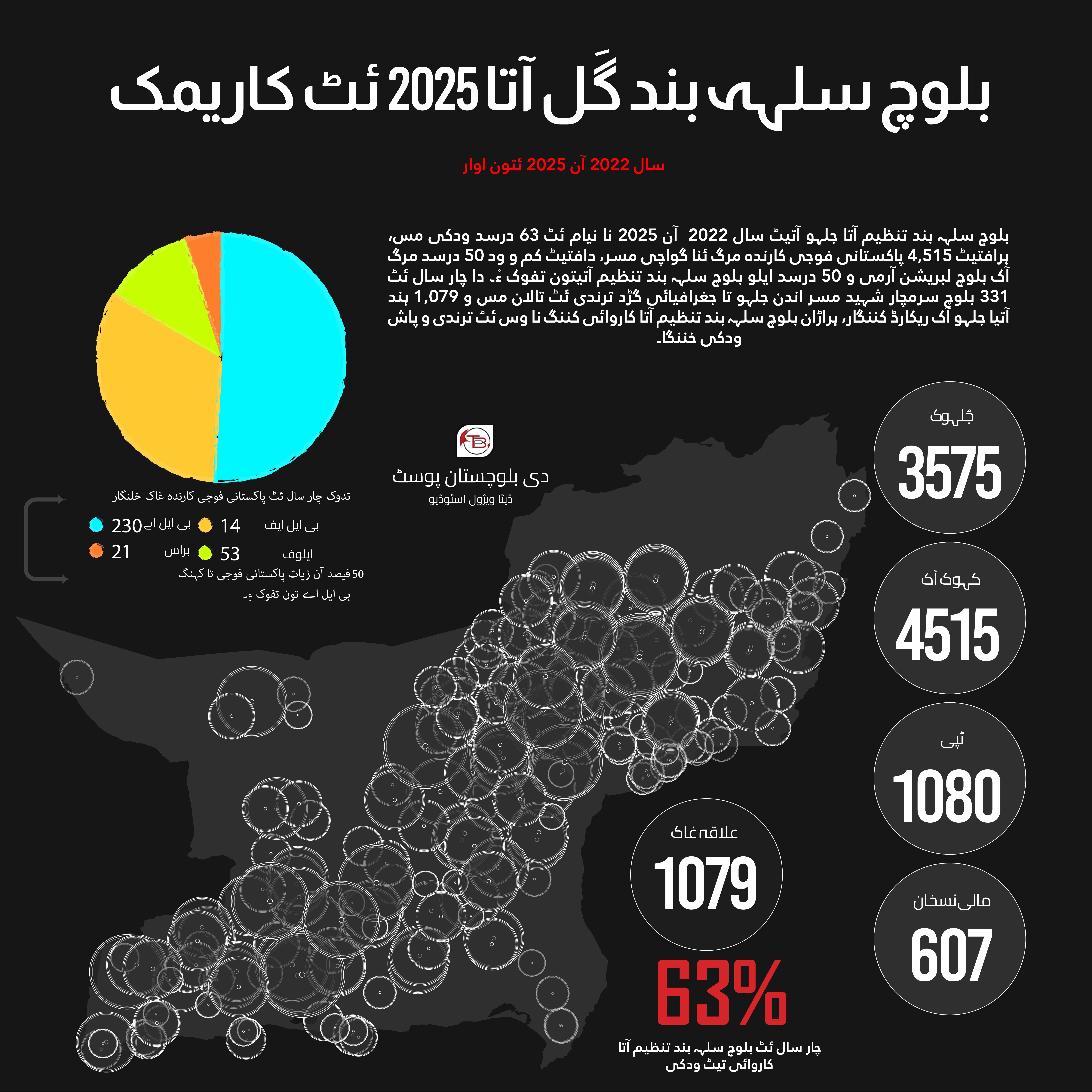 بلوچ سلہہ بند تنظیم آتا جلہو آتیٹ سال 2022 آن 2025 نا نیام ئٹ 63 درسد ودکی مس، ہرافتیٹ 4,515 پاکستانی فوجی کارندہ مرگ ئنا گواچی مسر، دافتیٹ کم و ود 50 درسد مرگ آک بلوچ لبریشن آرمی و 50 درسد ایلو بلوچ سلہہ بند تنظیم آتیتون تفوک ءُ۔ دا چار سال ئٹ 331 بلوچ سرمچار شہید مسر اندن جلہو تا جغرافیائی گڑد ترندی ئٹ تالان مس و 1,079 ہند آتیا جلہو آک ریکارڈ کننگار، ہراڑان بلوچ سلہہ بند تنظیم آتا کاروائی کننگ نا وس ئٹ ترندی و پاش ودکی خننگا۔