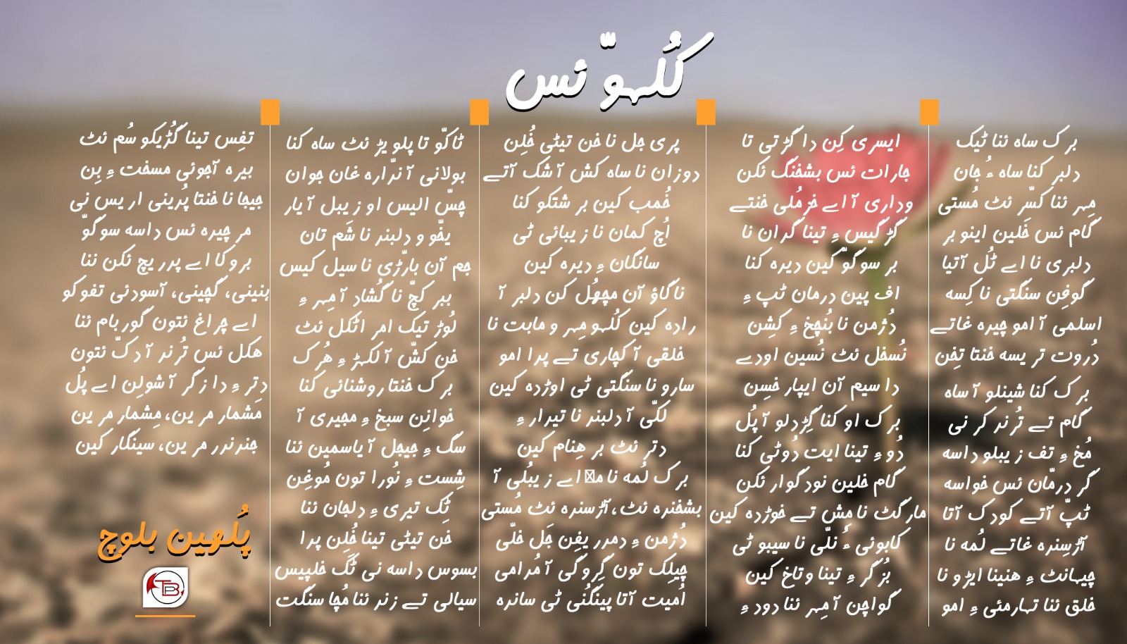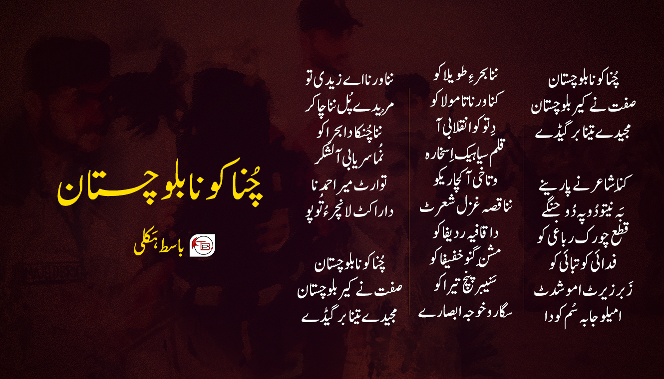 ای و نی۔۔۔، بَلو جنگ ئسے آن پد۔۔۔ دتر آن پُر وہوکا جو تیان و دتر نا گند ئٹ چرخ کروکا تہو تیان پد۔۔۔ بولان، سیاجی، باتیل، بڈو ٹی پند خلنگ آن پد۔۔۔ ہِس مروکا راسکوہ ءِ گلاب و سوسن بشخنگ آن پد۔۔۔ اُستاد اسلم نا سوچ ءِ ایمان کننگ آن پد۔۔۔ لُمہ یاسمین نا صبر ءِ کلمہ جوڑ کننگ آن پد۔۔۔ جِند ندر آتا جَن ئٹ مجید جان ءِ سجدہ کننگ آن پد۔۔۔ بیمسرک آ خیصار نا ندارہ تون بشخندہ ئسے آن پد۔۔۔ ٹِک تیر آ دل جان ءِ شور پارود نا خدا جوڑ کننگ آن پد۔۔۔ دلبر آ حق نواز نا خزمُلی خنتے و ساہ کش آ دروشُم ءِ داستانِ زیبائی کننگ آن پد۔۔۔ سُم تا امیل ئٹ امیر جان نا گڈیکو سُم ئنا فلسفہ ءِ ایمان جوڑ کننگ آن پد۔۔۔ زیبل آ و شتکو آ یار شوکت جان نا گُڈیکو جاہ ءِ بانکُر کننگ آن پد۔۔۔ شاشان نا ٹُل اٙ کوہِ سلیمان، کاہان و مکران ءِ سجدہ کننگ آن پد۔۔۔ لُمہ نا وداری اٙ خن تا دیدار آن پد۔۔۔ بے وس اٙ ایڑ ئنا بنگڑی تا شونقی آ توار آن پد۔۔۔ حانُل نا خلق ئٹ سرگنوک آ مُرید نا بننگ آن پد۔۔۔ دوزان نا آبِ زم زم انگا دیر تیان تینا ملاسی ءِ ایسر کننگ آن پد۔۔۔ دلبرو آ مچھُل ئٹ، دا ڈغار نا سرمچنڈ آ عاشق آتا کِسہ غاتِہ بننگ آن پد۔۔۔ ناگاؤ، نرمُک و اسپلنجی نا خرما خنّی تا جنگی اٹکل آتِہ سرپند مننگ آن پد۔۔۔ نوشکلی آ زباد ءِ، اُست ءِ تینا کروکا مِہر ءِ و شتک آ شاہ فہد نا دلاوری ءِ خواننگ آن پد۔۔۔ بولان، شور، چلتن، راکیل و شخاری ءِ طواف کننگ آن پد۔۔۔ ای و نی بیرہ ای و نی۔۔۔